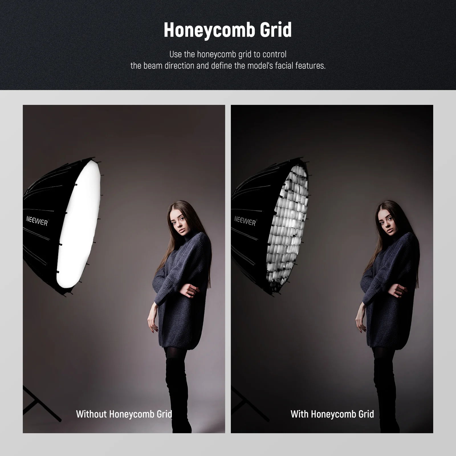 - Customizable Honeycomb Grid & Diffusers- Using the honeycomb grid can make the light shape more confined and directional, allowing the beam angle to be concentrated at 45°, which gives photographers a dramatic and expressive light effect to define their model's facial structure. The 2 pieces of high-quality diffusers can be freely combined in use