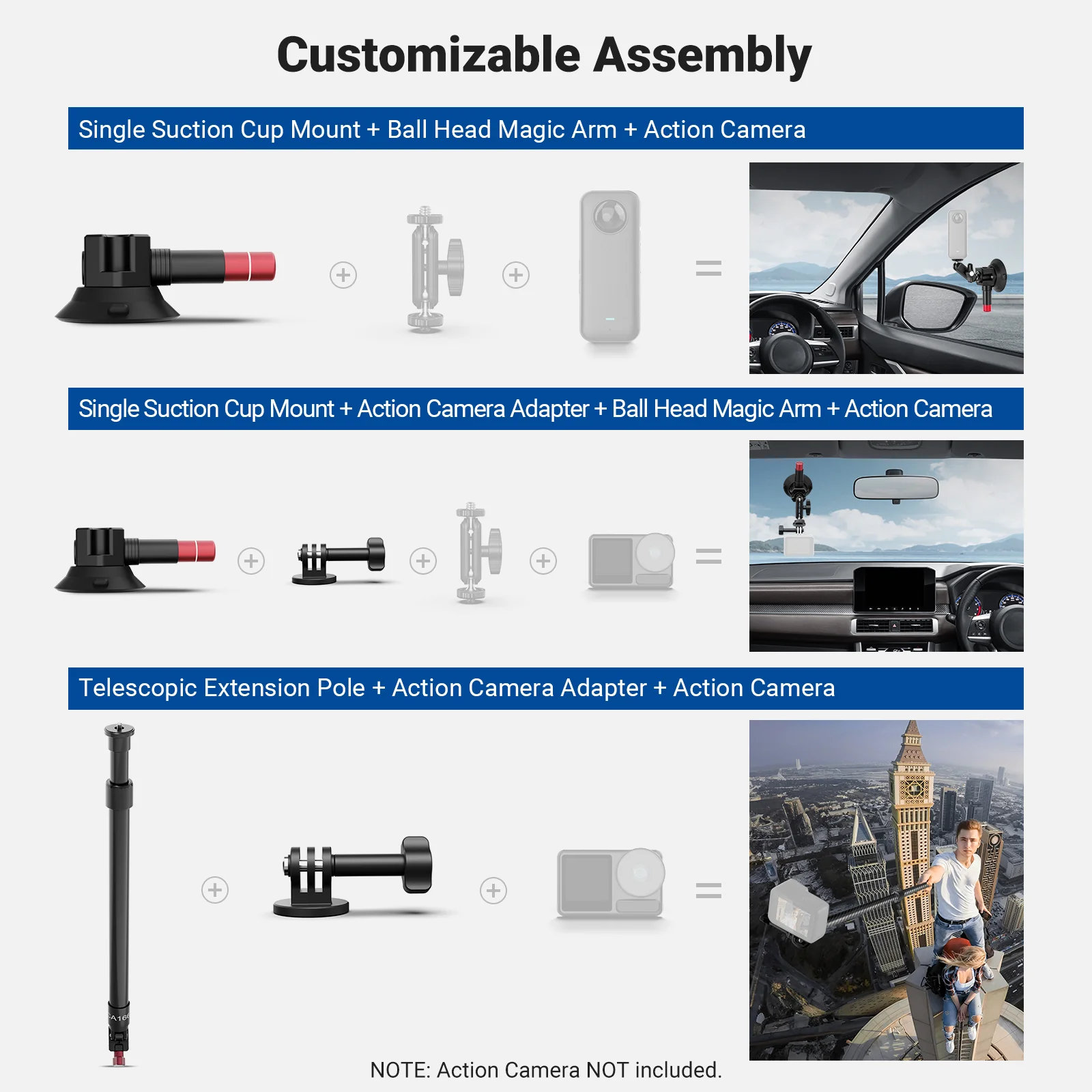 - Wide Compatibility- The suction cup car stand accessories kit as outside windshield holder or inside dash mount is compatible with GoPro Hero 13 Go Pro 12 11 10 9 8 Black DJI OSMO Nano Action 6 5 Pro 4 3 2 Insta360 X5 X4 X3 Insta 360 Ace Pro 2 Go 3S Brave 8 7 EK7000 via the action camera mounts & clamps or attachments