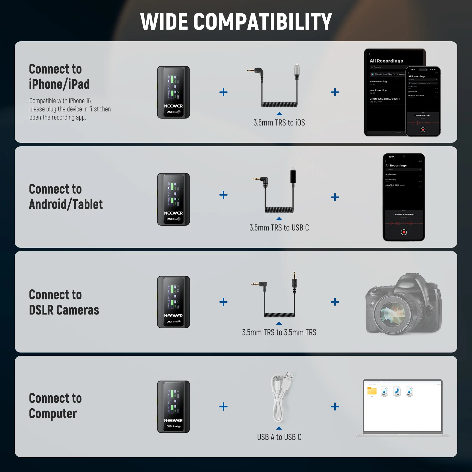 - 4GB Storage Standalone Recording- Each transmitter with 4GB storage doubles as a recording pen to save up to 9 hours of uncompressed 48KHz WAV audio files (up to 30min each) and supports decibel (dB) gain with a tap. Low frequency ensures accurate and warm voice recording. An LCD screen displays export modes, volume, battery levels, connection status, noise cancellation, and other info. 3 audio export modes available: Mono, Stereo, and Ms
