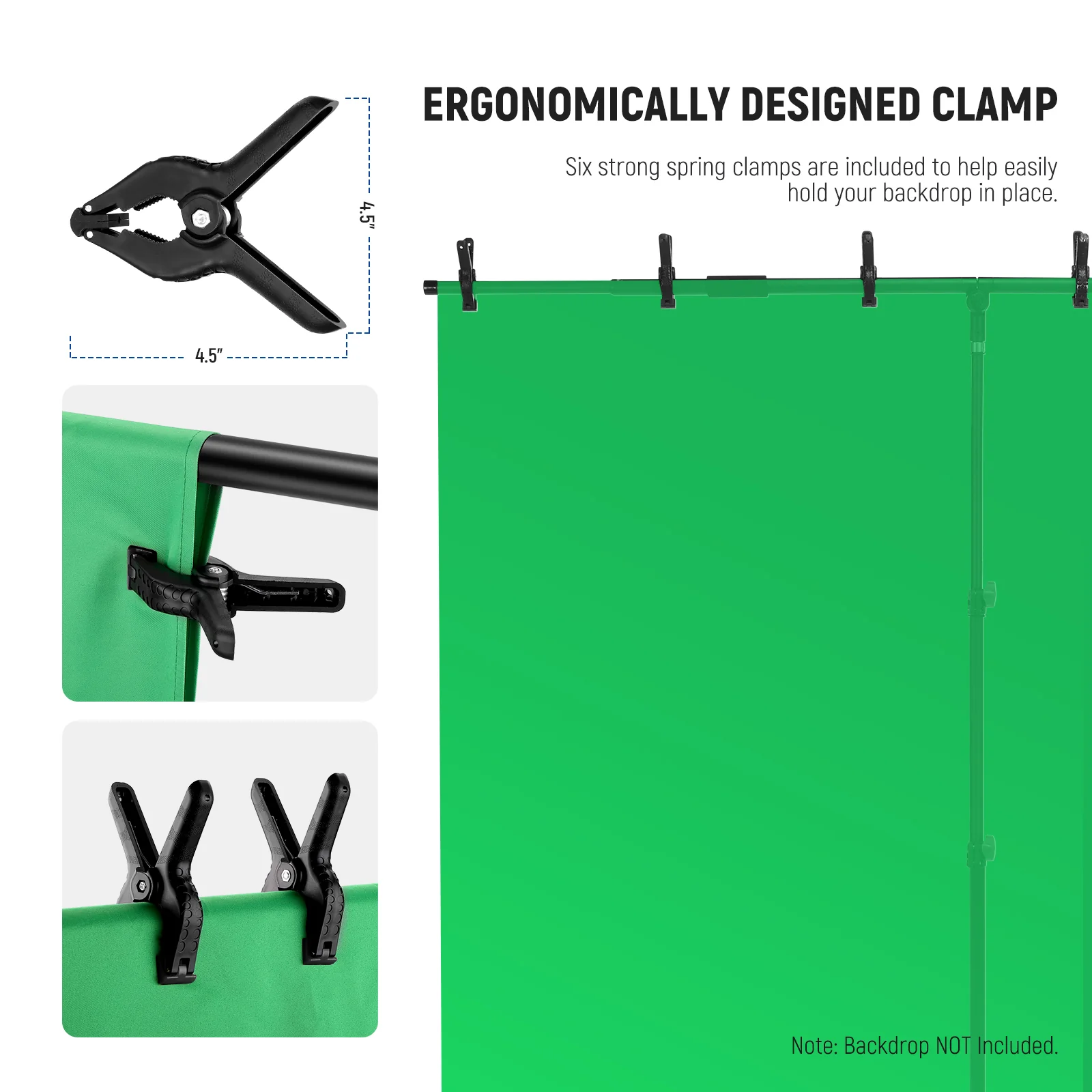 - 6 Premium Spring Clamps- Our background holder kit includes 6 spring clamps that provide a reliable grip to effortlessly hold your backdrop in place. Strong and easy to use, these clamps allow for quick setup of your background or materials, ensuring consistent performance even with frequent use