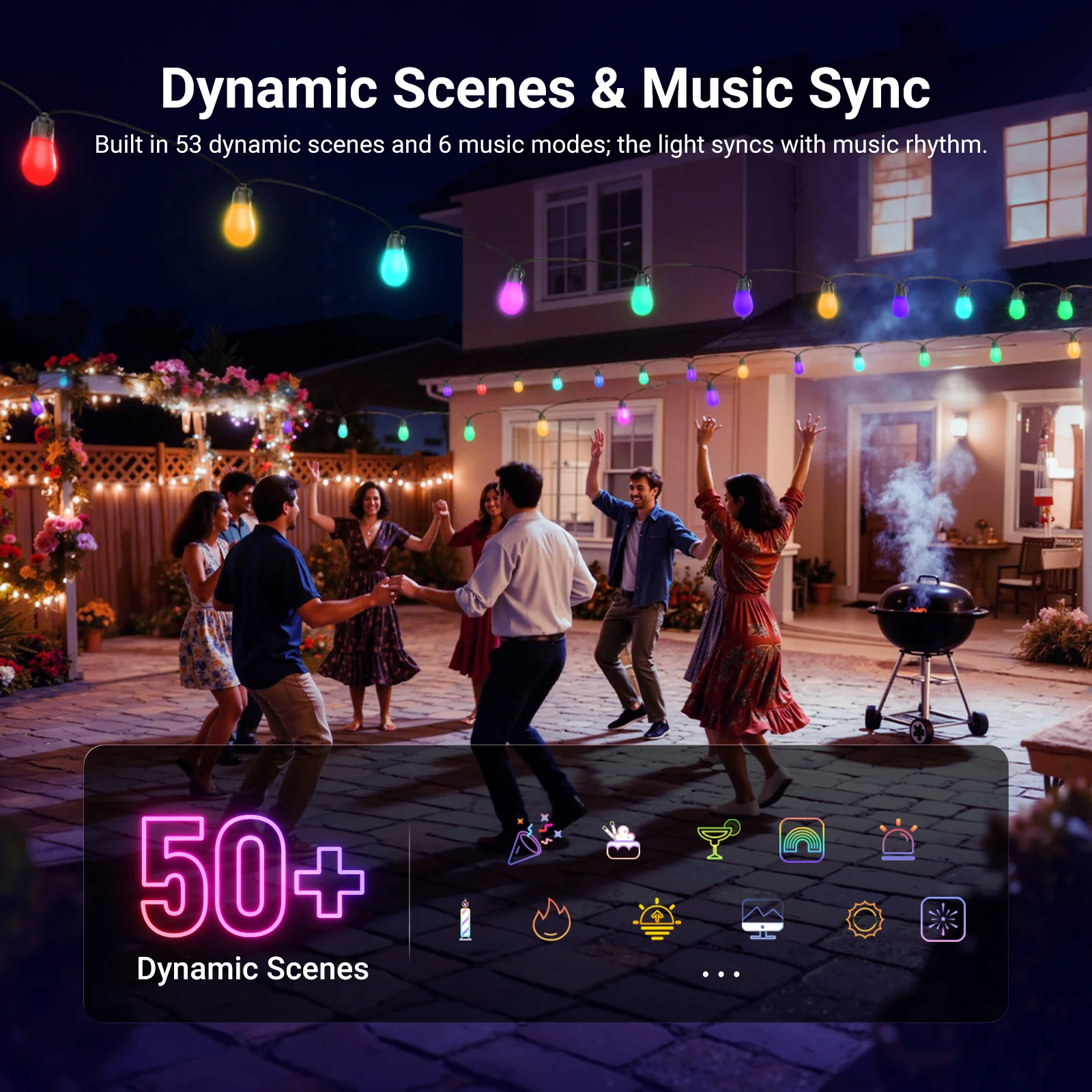 - Dynamic Scenes & DIY Mode- Featuring 50+ preset scenes with Daily Life, Holidays, Emotions, Nature, and continuous updates for more effects, our decorative waterproof outdoor string lights with smart color changing bulbs also support DIY customization via app as back yard balcony accessories, patio essential. Plug in lighting for Christmas, Halloween, Thanksgiving, Easter, birthday, camping tent/RV canopy awning decoration, indoor bedroom party, backyard garden wedding, out side yard market, etc
