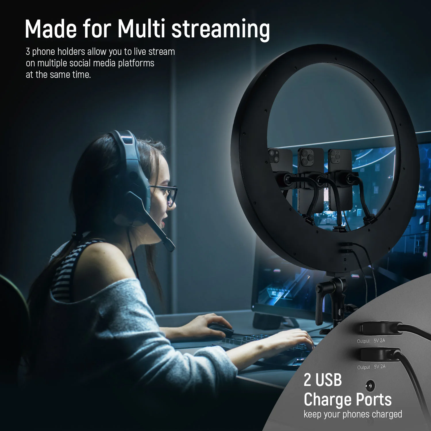- 3 Cold Shoe Ports & 2 USB Charging Ports- If you need to shoot with more cellphones or cameras, this is your best choice; 3 cold shoe ports allow you to mount three phones simultaneously. Also, it comes with 2 USB charging ports (5V 2A) for your smartphone charging while live streaming.