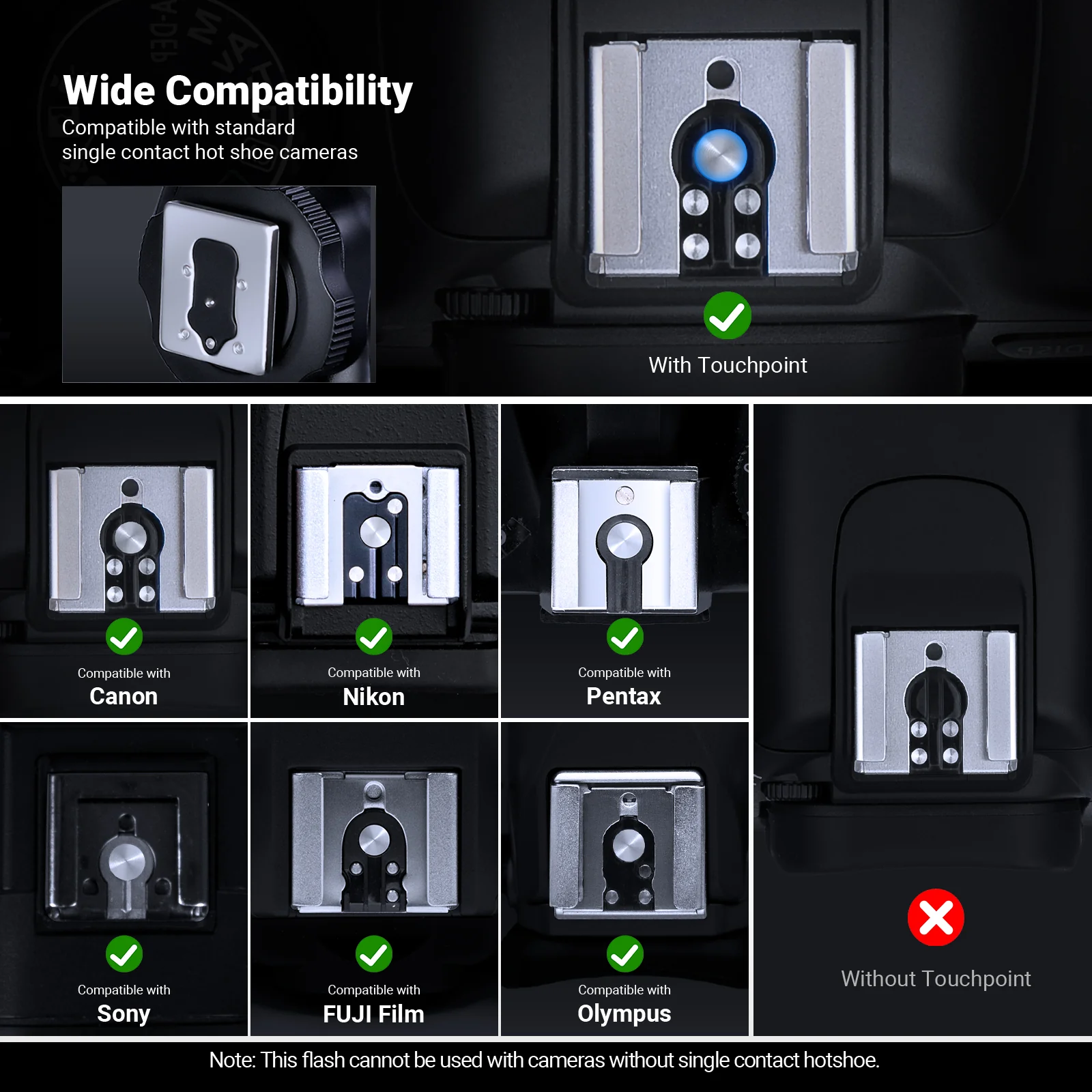 - Wide Compatibility- The flash attachment as photography accessories is compatible with Canon Nikon Panasonic Olympus Pentax Fujifilm standard hot shoe cams and Sony MI hot shoe models A9 A7III A7IV A7RIV A6400 ZV-1 A6000 A6300 A6500. Not compatible with Canon SL3 250D T7 1500D 2000D T100 3000D 4000D R6 200DII R50 Sony A9III A99 A77 A350 ZV-1F ZV1 Mark 2 Fujifilm X-A3X 100F X100T. Note: This flash cannot be used with cameras without single contact hotshoe. Disable electrical shutter during use